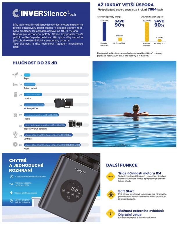 Mr. Pump ECO DE10 je moderné invertorové bazénové čerpadlo, ktoré kombinuje vysoký výkon, extrémne tichý chod a výraznú úsporu energie. Vďaka technológii InverSilence si automaticky prispôsobuje otáčky podľa aktuálnej potreby filtrácie, čím šetrí až desiatky percent elektrickej energie oproti klasickým čerpadlám.