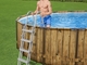Bazén Bestway Wood Swim Vista (vodná kapacita 23 062 litrov) je samonosný rodinný bazén. Nadzemný bazén na povrchovú montáž je vyrobený z trojvrstvového PVC. Vďaka svojej kovovej konštrukcii je veľmi pevný a stabilný. Upúta svojou jednoduchou montážou a dlhou životnosťou.