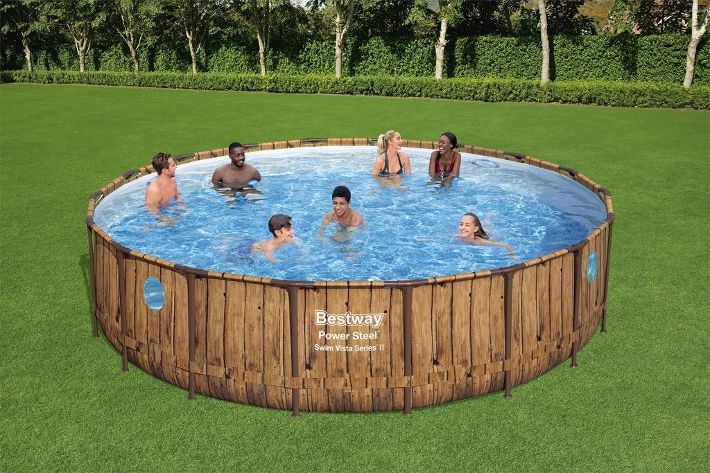 Bazén Bestway Wood Swim Vista (vodná kapacita 23 062 litrov) je samonosný rodinný bazén. Nadzemný bazén na povrchovú montáž je vyrobený z trojvrstvového PVC. Vďaka svojej kovovej konštrukcii je veľmi pevný a stabilný. Upúta svojou jednoduchou montážou a dlhou životnosťou.