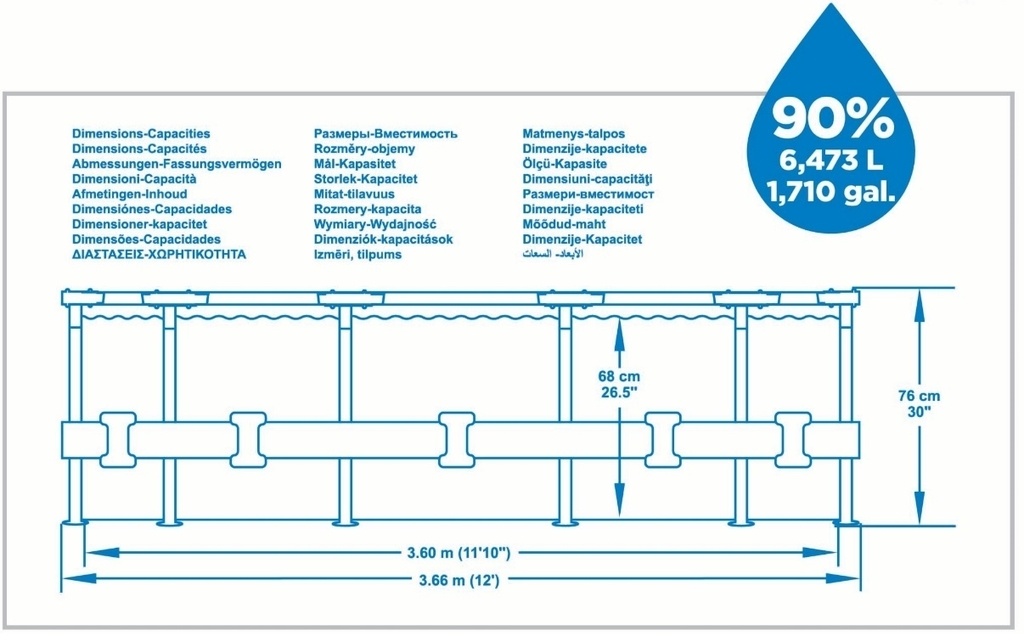Bazén Bestway (vodná kapacita 6473 litrov) je samonosný rodinný bazén. Nadzemný bazén na povrchovú montáž je vyrobený z trojvrstvového PVC. Vďaka svojej kovovej konštrukcii je veľmi pevný a stabilný. Upúta svojou jednoduchou montážou. Dlhá životnosť.