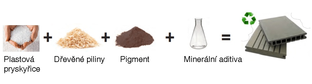 Materiál: kompozitná zmes dreva a polymérov. Horné kryty líšt sú vyrobené z ocele. Vertikálne lišty stien sú z hliníka.