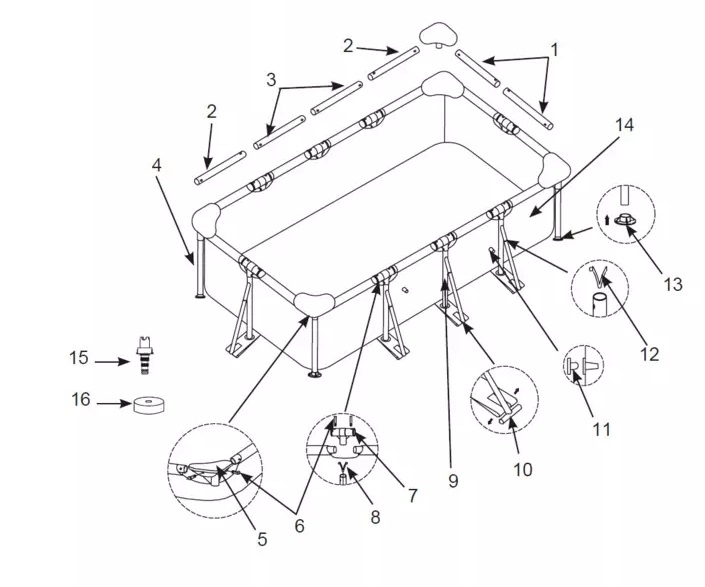 Kovová konštrukcia poskytuje vysokú stabilitu. K bazénu je možné pomocou hadíc s priemerom 32mm pripojiť pieskovú alebo kartušovú filtráciu.