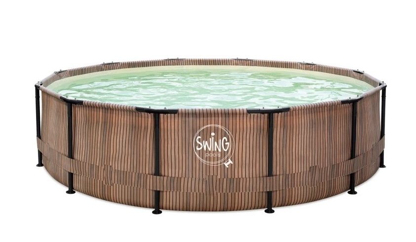 Nie je nad bazénmi s kovovou konštrukciou značky Swing – jednoduchá montáž, robustné prevedenie a dlhodobé používanie, to všetko ponúka tento záhradný bazén s motívom prírodného tíku.