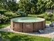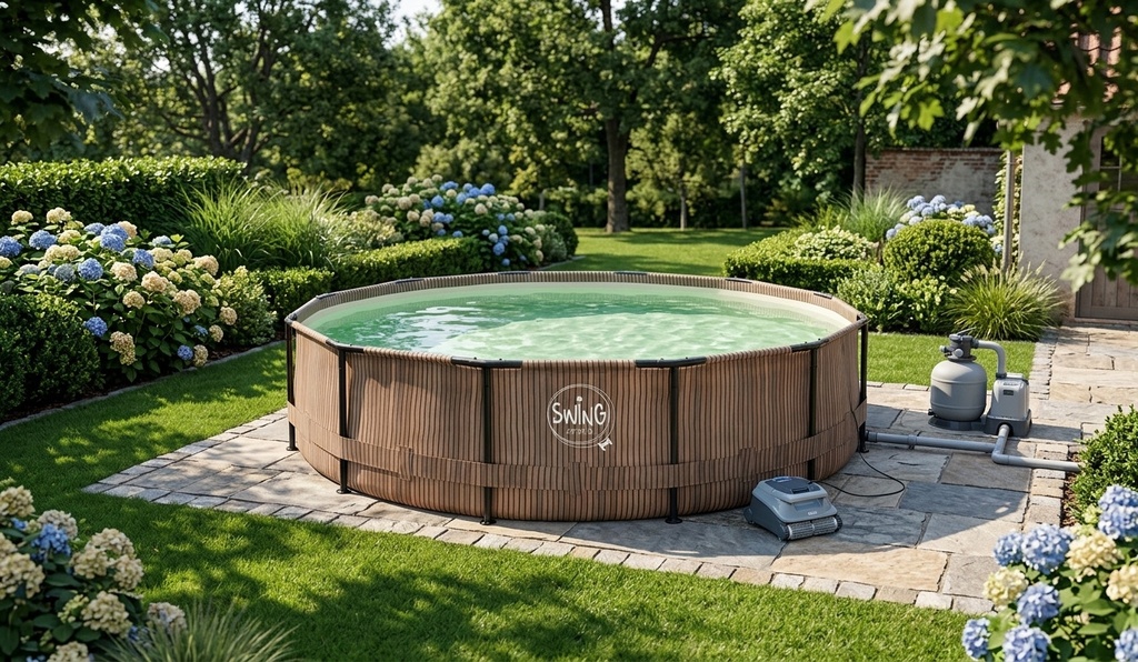 Nie je nad bazénmi s kovovou konštrukciou značky Swing – jednoduchá montáž, robustné prevedenie a dlhodobé používanie, to všetko ponúka tento záhradný bazén s motívom prírodného tíku.