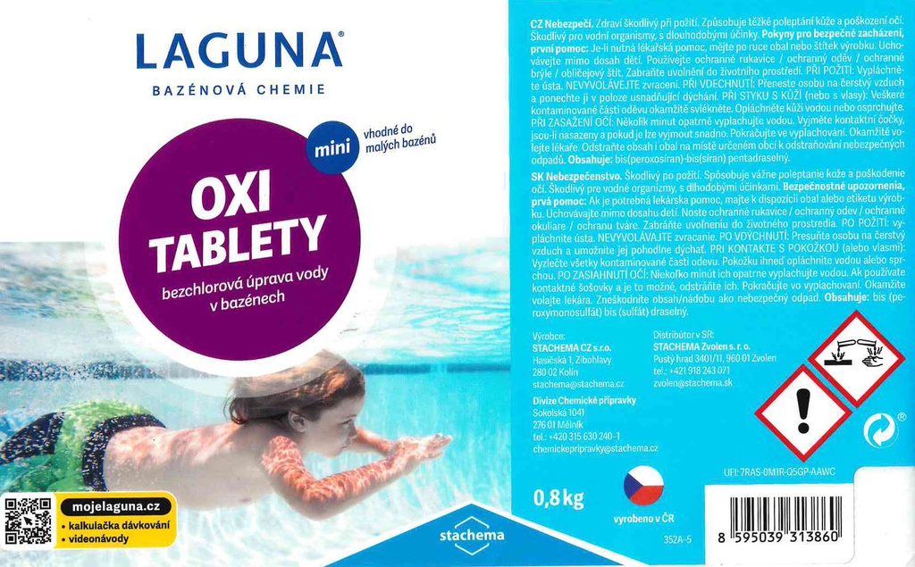 Pred prvým použitím Laguna OXI tabliet vždy upravte pH bazénovej vody na 6,8–7,6. Tablety dávkujte zberačom (skimmerom), plavákom alebo iným dávkovačom pri zapnutom filtračnom zariadení. Je nutné dodržiavať obsah voľného kyslíka v rozmedzí 8–15g/la pH v rozmedzí 6,8–7,6. Obsah voľného kyslíka a hodnotu pH kontrolujete cca 1–2 týždenne pomocou príslušného testera vody.