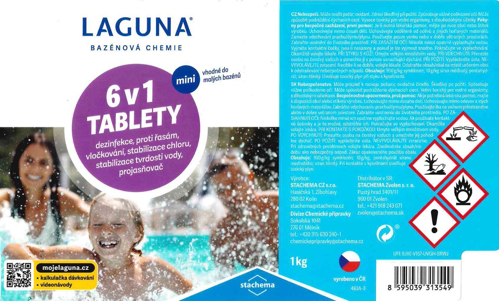 Laguna 6v1 tablety je moderný viacúčelový prípravok pre celosezónnu priebežnú údržbu vody vo všetkých typoch bazénov. Slúži ako dezinfekčný prípravok, súčasne umožňuje vyvločkovanie nečistôt, likviduje riasy a zabraňuje ich rastu, stabilizuje chlór vo vode, prejasňuje-zlepšuje zachytenie nečistôt vo filtrácii a stabilizuje tvrdosť vody.