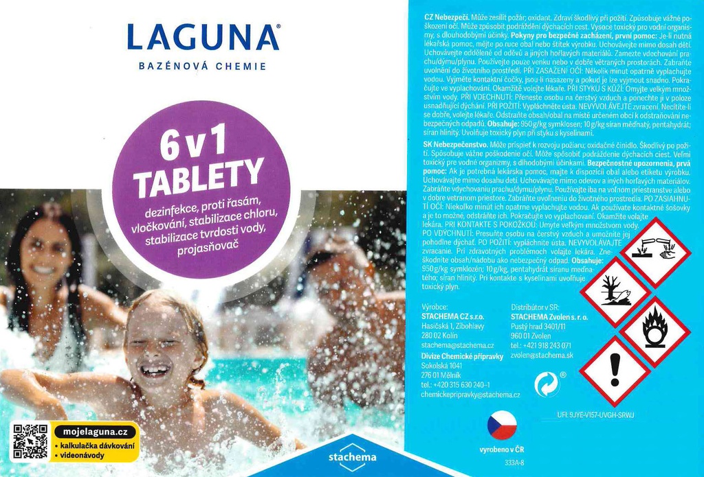 Laguna 6v1 tablety je moderný viacúčelový prípravok pre celosezónnu priebežnú údržbu vody vo všetkých typoch bazénov. Slúži ako dezinfekčný prípravok, súčasne umožňuje vyvločkovanie nečistôt, likviduje riasy a zabraňuje ich rastu, stabilizuje chlór vo vode, prejasňuje-zlepšuje zachytenie nečistôt vo filtrácii a stabilizuje tvrdosť vody.