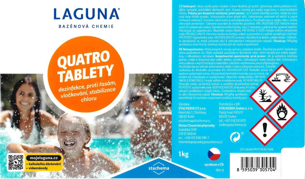 Laguna Quatro tablety slúžia ako dezinfekčný prípravok pre celosezónnu priebežnú údržbu vody vo všetkých typoch bazénov. Súčasne umožňuje vyvločkovanie nečistôt, pôsobí ako stabilizátor aktívneho chlóru, likviduje riasy a zabraňuje ich rastu. Obsah 5ks tabliet po 200g.