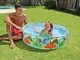 Detský bazén s rozmermi Ø 122 × 25 cm a pevnými, priehľadnými plastovými bočnými stenami s veselou potlačou zvieracích motívov.