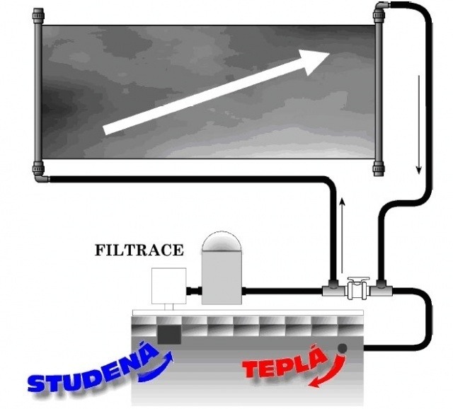 Chladná voda z bazéna je pomocou filtračného systému vháňaná do panelu, kde s pôsobením slnečných lúčov ohrieva a teplejšie sa vracia do bazéna.