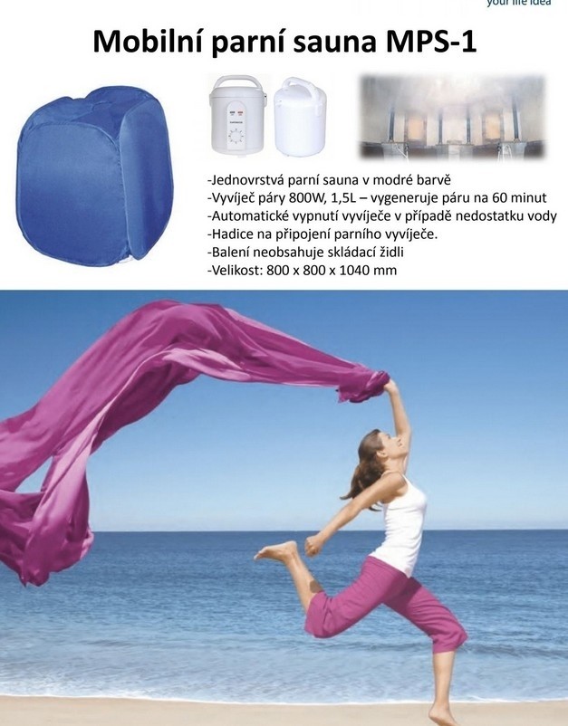 Prenosná parná sauna MPS-1 v sebe kombinuje parnú liečebnú kôru s modernou technológiou. Je malá, prenosná a ľahko sa zmestí aj do malého obývacieho priestoru. Saunovanie pomáha redukovať nadbytočný podkožný tuk, soľ alebo vlhkosť, blahodárne pôsobí na kardiovaskulárny systém a slúži ako prevencia choroby srdca. Výparník vďaka ohrevu vody vytvára horúcu paru, ktorá pozitívne pôsobí na ľudské telo, detoxikuje organizmus, zlepšuje dýchanie, podporuje chuť do jedla, regeneráciu svalov a kĺbov a všeobecnú relaxáciu. Nie je potrebné žiadne špeciálne inštalácie, iba zaistiť prívod 220 V a vlastnú stoličku na sedenie (odporúča sa nerezová, najlepšie PVC). Oddýchnite si po fyzickej aj psychickej stránke.