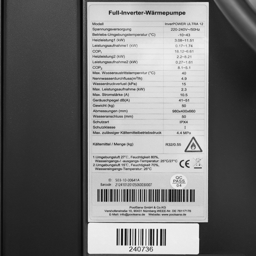Tepelné čerpadlo POOLSANA InverPOWER ULTRA 12 s chladením je vysoko efektívne a energeticky úsporné tepelné čerpadlo s technológiou full-inverter ponúka až 11,51 kW vykurovacieho výkonu pri nízkej spotrebe energie (0,17–1,74 kW) a ultra vysoký COP až 18,12. Elegantný kovový kryt, digitálne ovládanie s dotykovým displejom a integrovaná WiFi funkcia umožňujúca pohodlné ovládanie cez aplikáciu. Tepelné čerpadlo podporuje kúrenie, chladenie aj automatický režim a je vhodné pre bazény do 45 m³.
