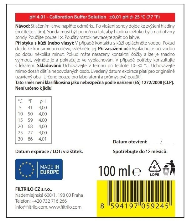 Odporúčania pre prax: pH 4.1 je možné použiť samostatne pre jednobodovú kalibráciu alebo ako súčasť viacstupňovej kalibrácie (typicky pH 4.01 / 7.00 / 10.01) pre maximálnu presnosť v širšom rozsahu merania.