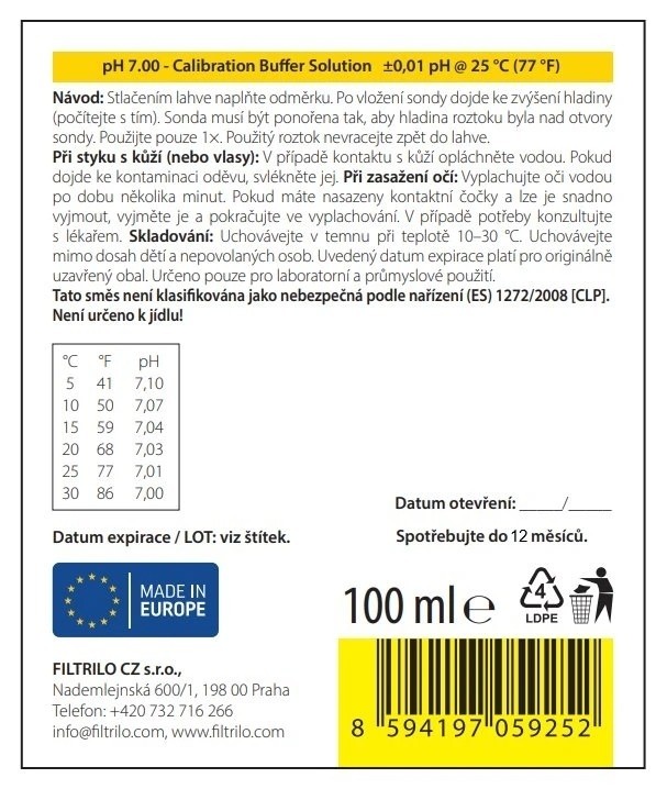 Kalibračný pufrový roztok pH 7.00 je určený na kalibráciu a overovanie pH elektród, pH metrov a pH senzorov v neutrálnom rozsahu, a to ako v laboratórnej praxi, tak v prevádzkových a priemyselných aplikáciách. Jedná sa o certifikovaný pufrovací roztok s metrologickou sledovateľnosťou, určený na kalibráciu a overovanie senzorov v priemyselných aplikáciách.