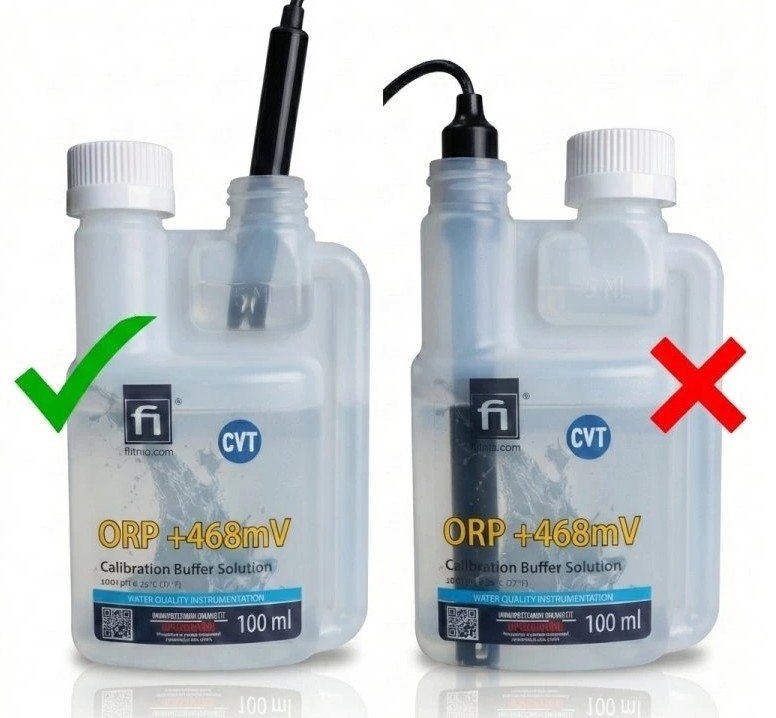 Hodnota pH je definovaná pri 25 °C (77 °F) a etiketa uvádza tiež teplotnú závislosť, čo uľahčuje korektnú kalibráciu aj mimo štandardnej teploty. Pre zachovanie presnosti je nutné roztok použiť iba jednorazovo. Stlačením fľaštičky naplňte integrovanú odmernú dávkovaciu komôrku a do nej ponorte testovaciu sondu. Po vložení sondy dôjde k zvýšeniu hladiny (počítajte s tým). Sonda musí byť ponorená tak, aby hladina roztoku bola nad otvormi sondy. Po použití roztok vylejte do odpadu. Použitý roztok nikdy nevracajte späť do originálneho obalu.