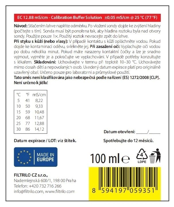 Kalibračný roztok EC 12,88 mS/cm je určený na kalibráciu a overovanie vodivostných (EC) sond, EC prístrojov (konduktometrov) a EC senzorov, a to ako v laboratórnej praxi, tak v prevádzkových a priemyselných aplikáciách. Jedná sa o certifikovaný kalibračný roztok s metrologickou sledovateľnosťou, určený na kalibráciu a overovanie senzorov v priemyselných aplikáciách.