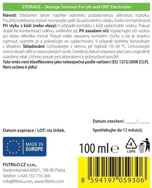 Skladovací roztok STORAGE (3 M KCl) je určený na skladovanie a udržiavanie pH a ORP (RedOx) elektród a ďalších elektrochemických sond s referenčným systémom na báze KCl. Používa sa v laboratórnej praxi aj v prevádzkových a priemyselných aplikáciách na to, aby membrána a referenčný spoj (junction) nevysychali, elektróda zostala kondicionovaná a bola pripravená na meranie.