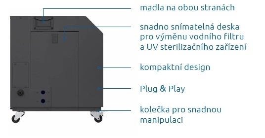 Vnútri zariadenia sa nachádza Cirkulačné čerpadlo so samonasávacím systémom, vodný filter, UV sterilizátor a kartušová filtrácia.