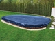 Plachta na oválny bazén 7,3 × 3,7m (skutočný rozmer plachty je cca 8,0 × 4,4m).