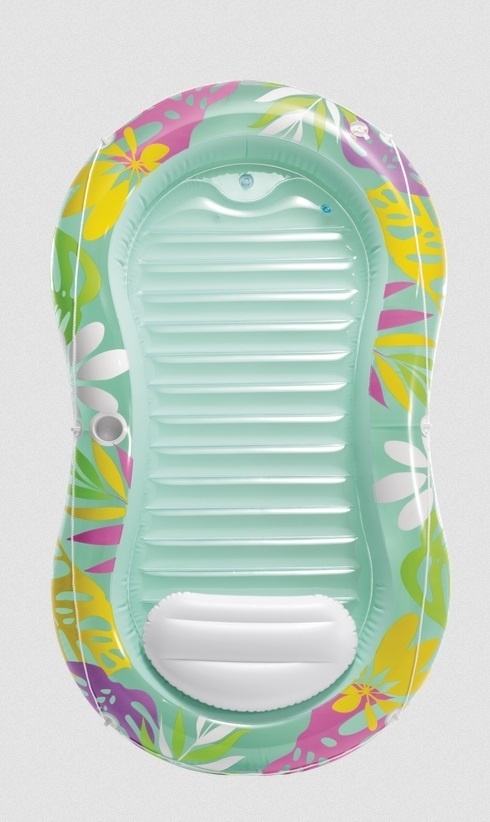 Nafukovacie lehátko Tropical Oasis so zvýšeným okrajom a vankúšikom pre pohodlnú relaxáciu na vode.