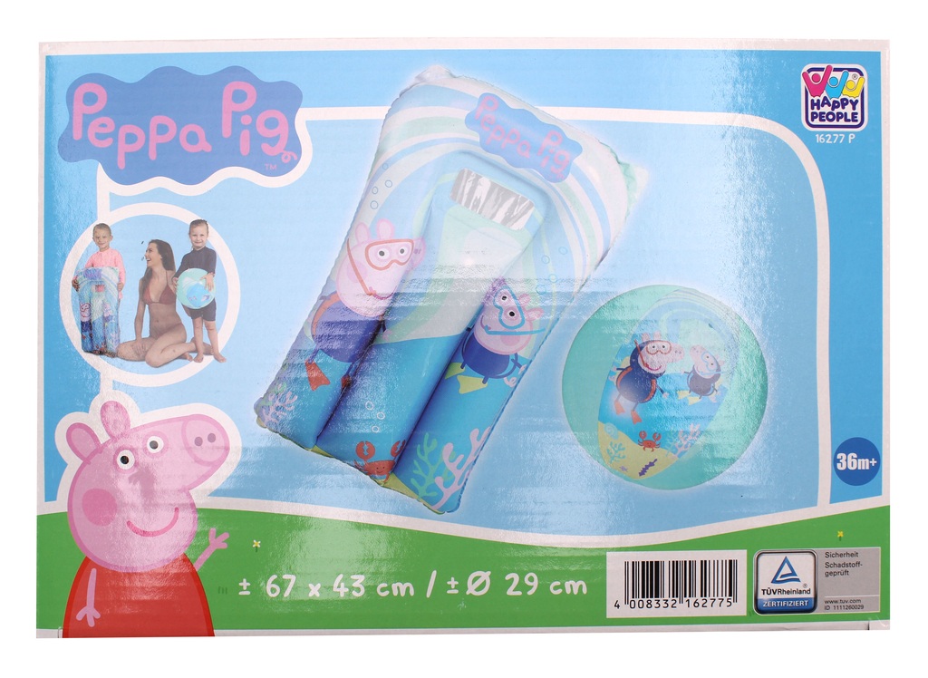 Plážový set obsahuje nafukovacie lehátko s okienkom o rozmeroch 67×43cm a nafukovacia lopta s priemerom cca 29cm.