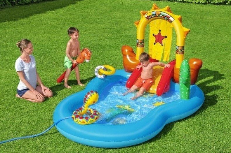 Toto herné centrum má tiež odnímateľnú šmykľavku so slnečným oblúkom, ktorý ich víta na Divokom západe.