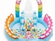 Zábavné nafukovacie hracie centrum s bazénikom, šmykľavkou, spŕškou, ktorá po napojení na záhradnú hadicu strieka vodu a 6-tich loptičky na hádzanie do kruhov alebo iné aktivity na hracom centre.