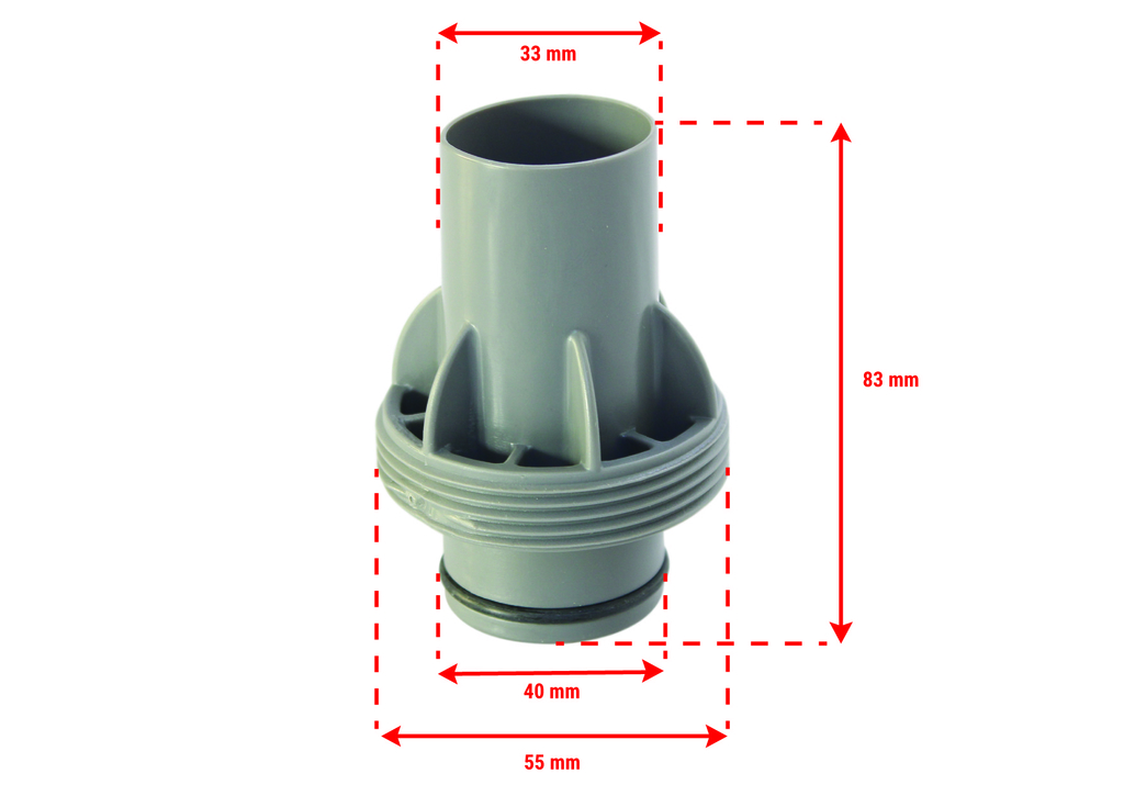 Adaptér sa nasadzuje na vývod z bazéna s priemerom 32mm az druhej strany sa pripája hadica so šróbením 38mm.