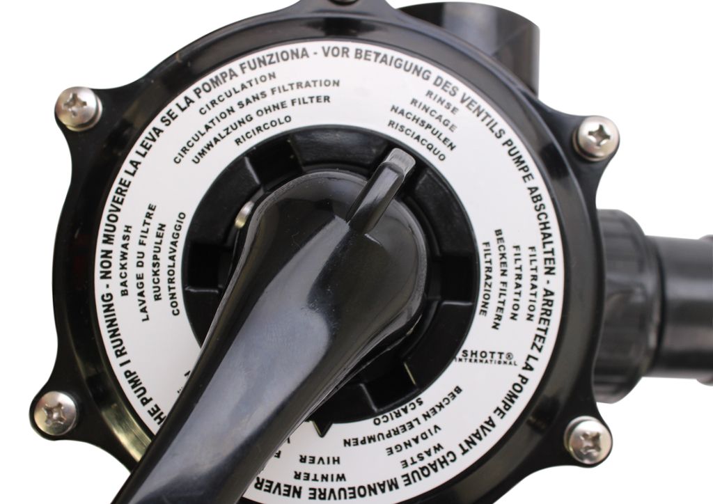 6-cestný ovládací ventil pre filtračné nádoby Shott s bočným ventilom. Určené iba pre pieskové filtrácie značky Shott.