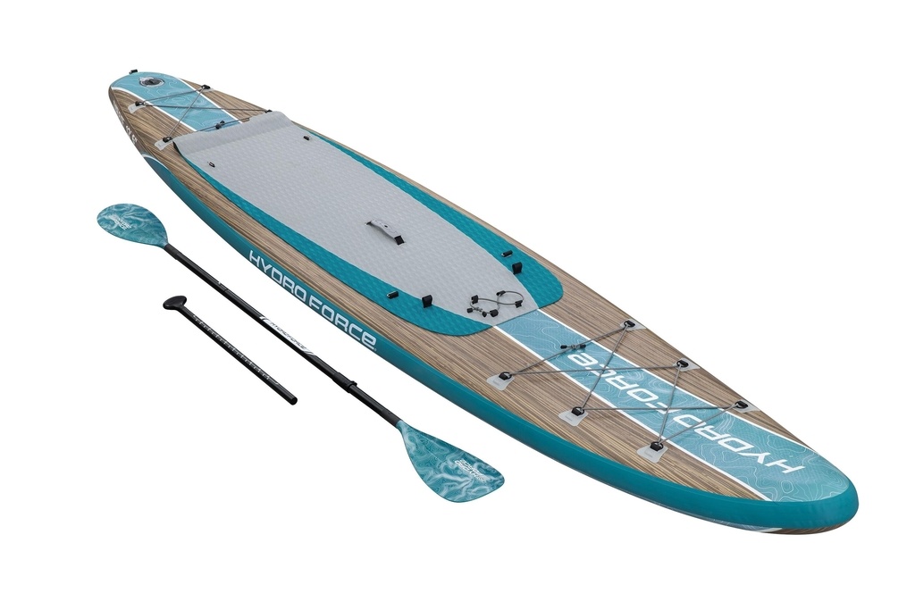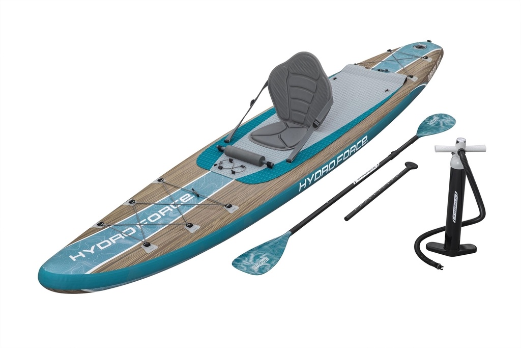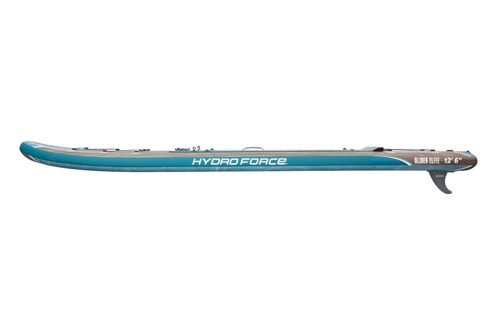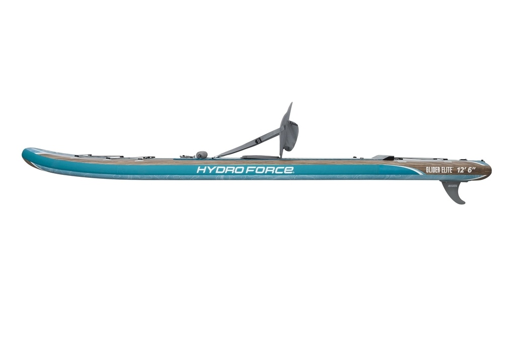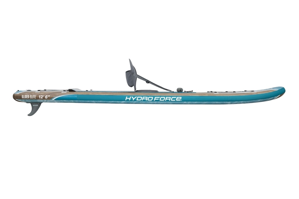 Nafukovacia doska Hydro Force SUP Touring Board-Set Glider Elite od spoločnosti Bestway s rozmermi 381 × 79 × 15 cm je ideálnym spôsobom, ako zostať aktívna pri vode. Skvele vyrobená doska s protišmykovou diamantovou trakčnou podložkou s kick Pad, veľmi dobre tvarovaná s pružným surferským vodítkom sa osvedčí na nejednom vodnom diele.