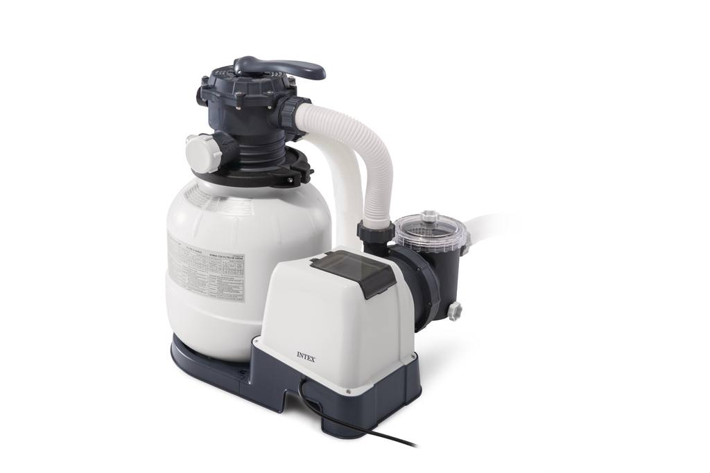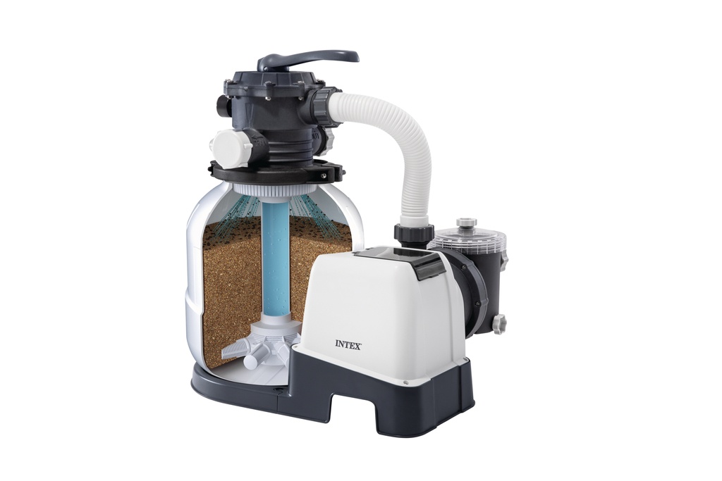 Piesková filtrácia od firmy INTEX pre nadzemné bazény. Filtračné zariadenie sa skladá z plastovej podstavy, filtračnej nádoby z polypropylénu bez švov, 6-cestného ventilu, manometra a čerpadla. Filtračná nádoba je prepojená s čerpadlom flexibilnou hadicou.