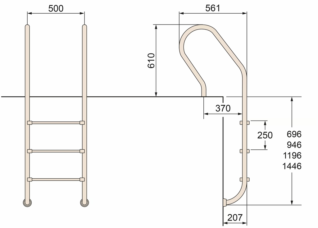 Rebríky sú určené pre privátne a komerčné bazény. Sú vyrobené z leštenej nerez ocele. AISI 316 priemeru 43 mm. Stupne sú doplnené protišmykom. nášľapy. Kotvenie sa dodáva s puzdrom a svorkou na uzemnenie.