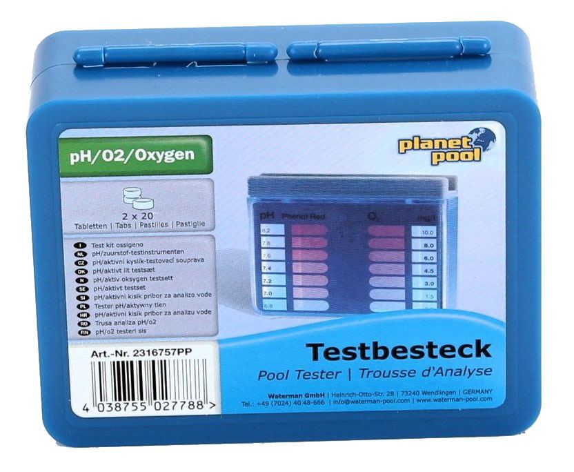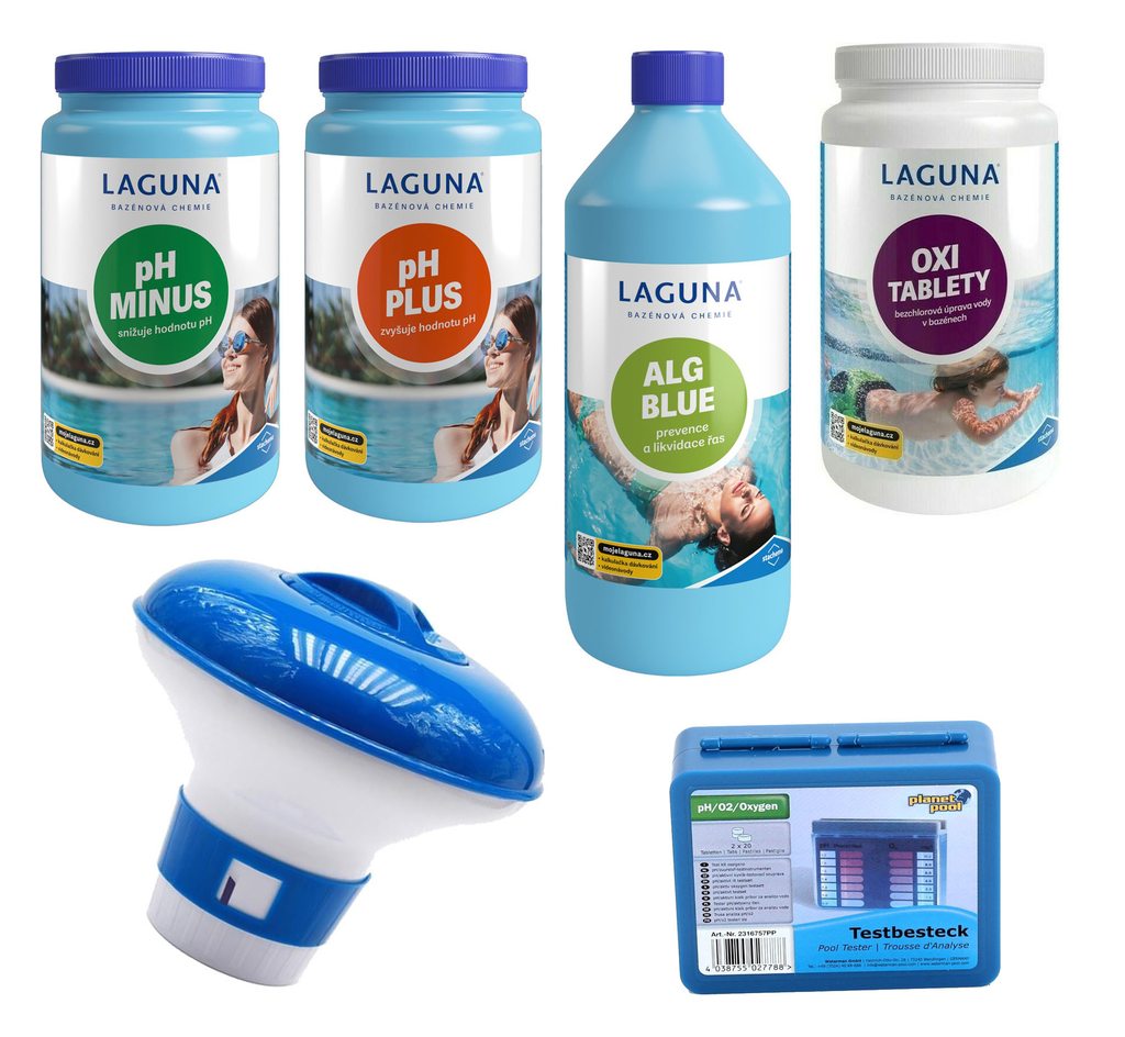 Kompletný set bezchlórovej chémie, testera a plaváka na ošetrenie bazénovej vody. Na dosiahnutie krištáľovo čistej a trvalo hygienicky nazávadnej vody je bezpodmienečne nutné udržovať obsah voľného kyslíka v rozmedzí 8–15g/la pH v rozmedzí 6,8–7,6. Obsah kyslíka v bazénovej vode a hodnota pH sa priebežne kontrolujú testermi najmenej 1–2× týždenne.