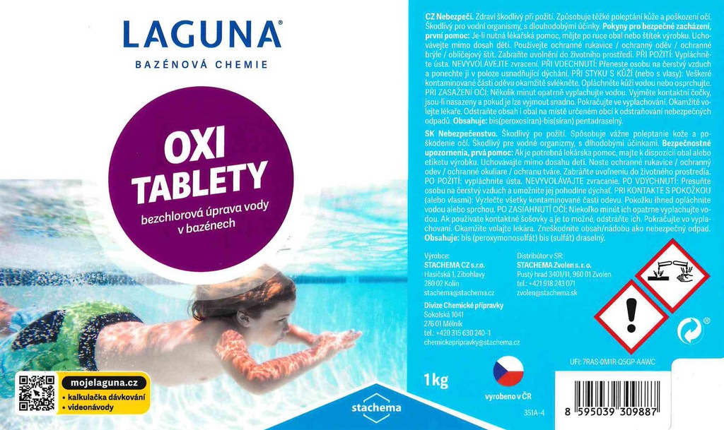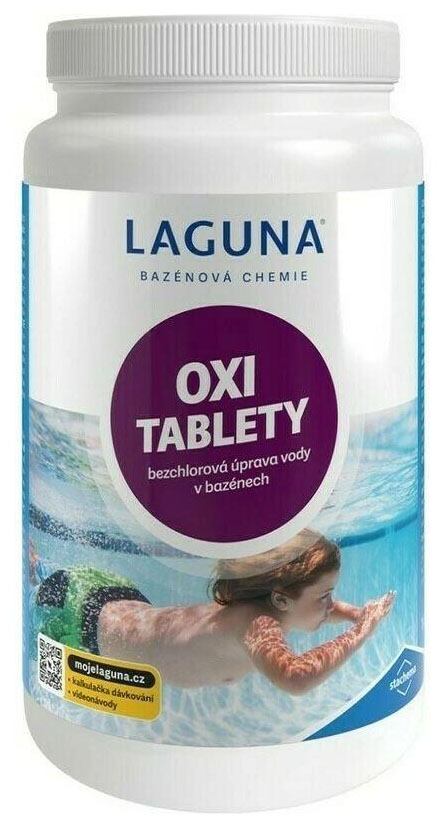 Potom vodu ošetrite použitím tabliet OXI. Počiatočná šoková dávka 2ks tablety na 20m3 bazénovej vody. Priebežné dávkovanie 1ks tablety na 20m3 bazénovej vody. Pri vyššej teplote bazénovej vody kontrolujte namerané hodnoty až 3×týždenne. Pri teplote nad 23 ° C odporúčame pre zachovanie čistej vody pridávať prípravok proti riasam Laguna ALG blue. Tablety dávkujte zberačom (skimmerom), plavákom alebo iným dávkovačom pri zapnutom filtračnom zariadení. POZOR-nikdy nevhadzujete tablety priamo do bazéna!! Priamy kontakt tablety s fóliou môže spôsobiť jej vybielenie.
