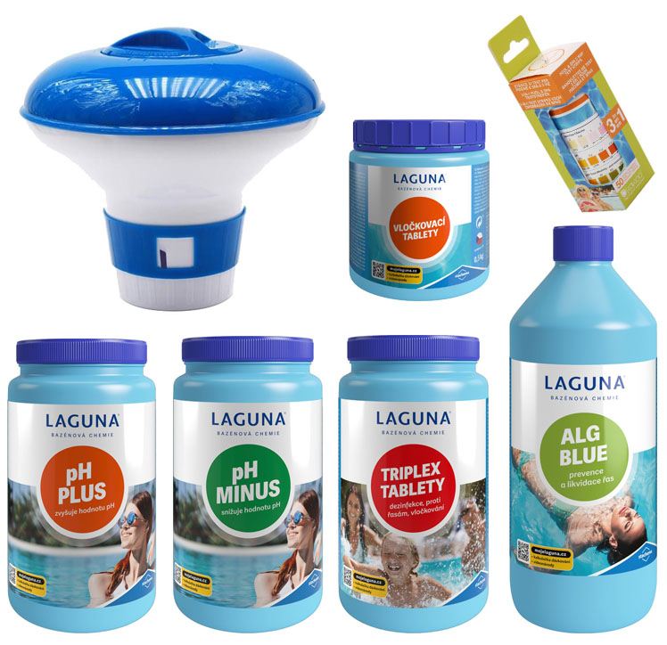 Set bazénovej chémie na kompletnú chlórovú úpravu bazénovej vody. Obsahuje Triplex tablety 200g 1kg, pH- 1,5kg, pH + 0,9kg, Algicid ALG Blue 1l, Vločkovacie tablety 0,5kg, tester vody, plavák na chlórové tablety veľký