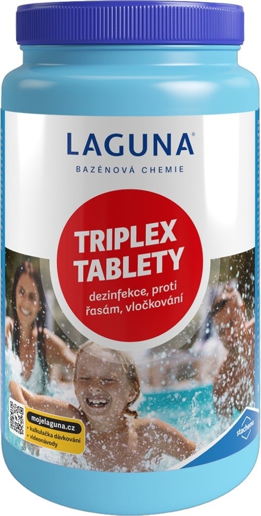 Potom použite na ošetrenie bazénovej vody prípravok Triplex tablety. Po aplikácii prípravku Triplex tablety dochádza k postupnému uvoľňovaniu chlóru (dezinfekciu a oxidáciu organického znečistenia vody) a zároveň k rozpúšťaniu látky s aglicidním účinkom (prevencia a likvidácia rias) a vločkovača (odstraňuje prípadné zakalenie vody vyvločkovaním nečistôt). Podľa teploty vody pridávajte každých 6 - 8 dní 1 - 2 tablety (200 - 400g) na 30m3 (30000l) vody, 1 tabletu pri teplote do 25 ° C, 2 tablety nad 25 ° C. Tablety sa dávkujú skimmerom, alebo plavákom pri zapnutom filtračnom zariadení.