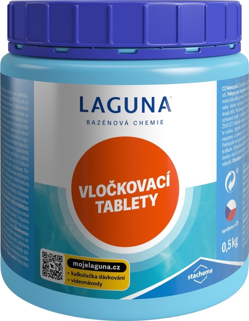 Prípravok Laguna vločkovacie tablety sa používa, ak aj pri správnych hodnotách pH a obsahu aktívneho chlóru je voda v bazéne kalná. Dávkovanie 1 tableta na 5m3 bazénovej vody. V prípade tvorby zákalu alebo pre odstránenie drobných nečistôt vo vode vložte vhodný počet tabliet do skimmera (chlorinátora) a nechajte ich rozpustiť. POZOR nedávkujte spoločne v rovnaký deň s prípravkami proti riasam !! Prípravky proti riasam je možné dávkovať najskôr 24hodín po rozpustení vločkovač tabliet.