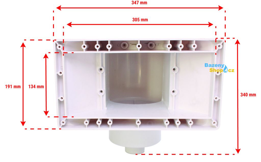 Skimmer, alebo zberač hladinových nečistôt. Hladinové nečistoty skimmer sťahuje do filtračnej jednotky (pieskový filter). Set skimmera s vratnou tryskou (tento set dodávaný od 15.4.2015). Rozmer rámčeka 30×13,5 cm (vnútorný otvor vtoku vody z bazéna).